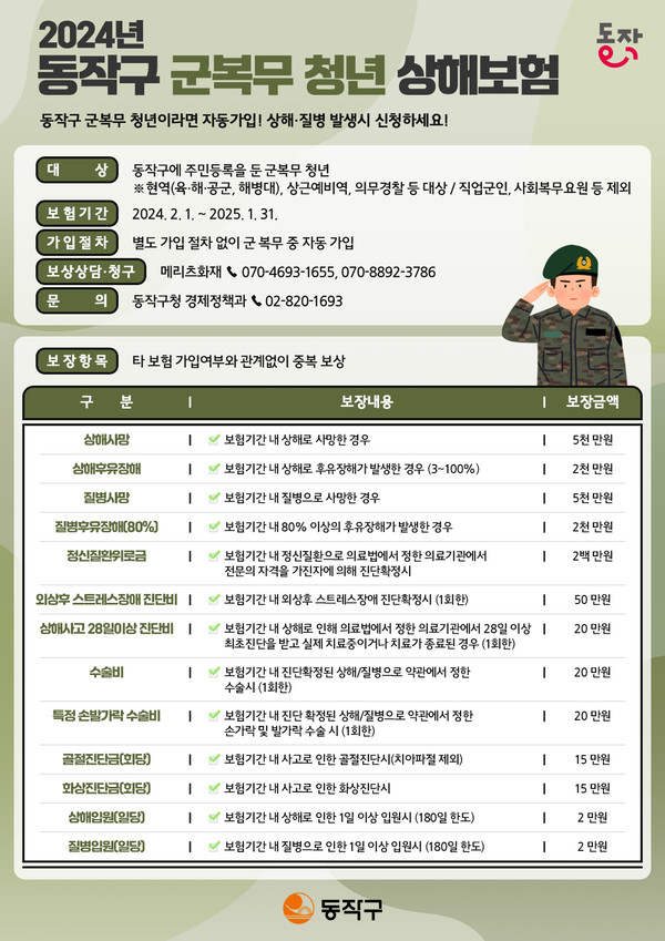 이번 상해보험 지원 사업은 동작구에 주민등록을 둔 군 복무 청년이면 별도의 가입 절차 없이 입대 시 단체 상해보험에 자동 가입돼 안전하게 국토방위 의무를 전념할 수 있도록 돕는다.
