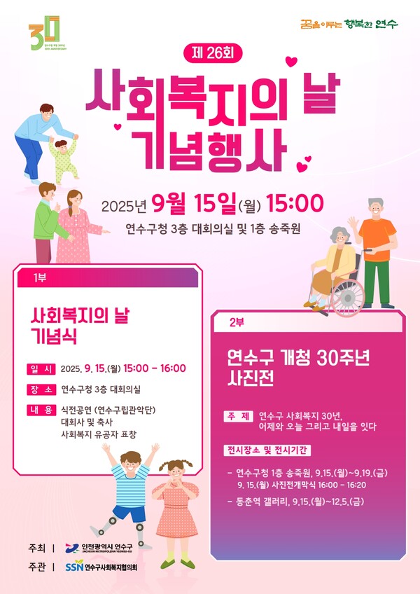 이번 행사는 지역사회 복지 발전에 이바지한 유공자를 격려하고, 지난 30년간 연수구 사회복지 변천사와 복지에 대한 공감과 참여를 유도하는 자리로 꾸며질 예정이다.