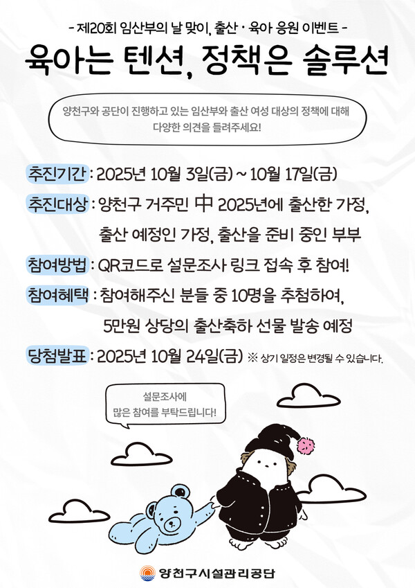 양천구시설관리공단은 오는 10월 3일부터 17일까지 ‘육아는 텐션, 정책은 솔루션’, 양천구 출산·육아 응원 이벤트를 진행한다고 밝혔다.