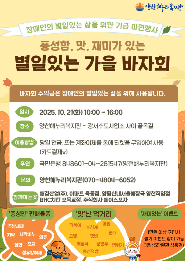 양천해누리복지관은 오는 10월 21일 복지관 앞 골목에서 장애인복지 기금 마련을 위한‘별일있는 가을 바자회’를 개최한다.