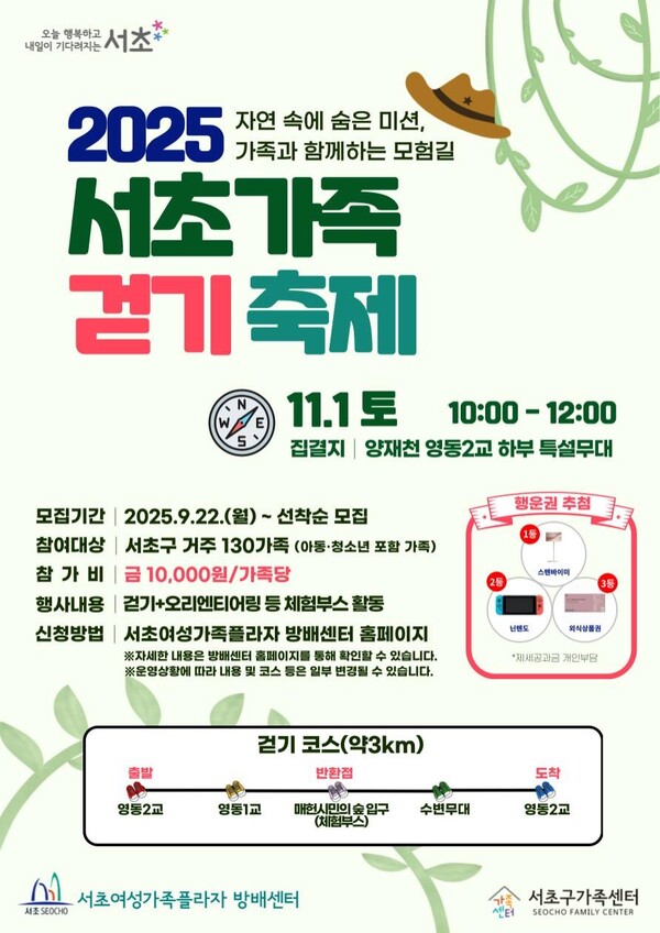 서초구는 서초여성가족플라자 방배센터, 서초구 가족센터와 함께 11월 1일 서울의 대표적인 생태하천인 양재천에서 ‘2025 서초가족 걷기 축제’를 개최한다고 밝혔다.
