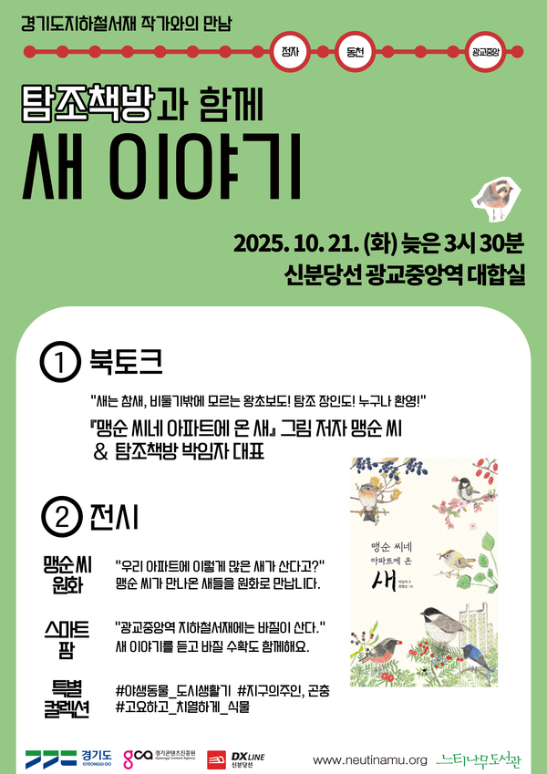 경기콘텐츠진흥원과 느티나무재단은 오는 10월 21일 오후 3시 30분부터 5시까지 신분당선 광교중앙역 대합실에 있는 지하철 서재에서 ‘탐조책방과 함께 새 이야기’ 북토크를 연다.