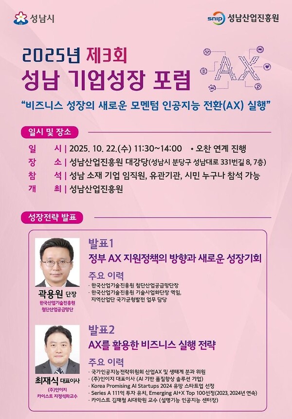 성남산업진흥원은 오는 22일 11시 30분부터 ‘인공지능 전환 실행 전략’을 주제로 2025년 제3회 ‘성남기업성장포럼’을 개최한다. 이번 포럼은 성남시 중소기업의 성공적인 ‘인공지능 전환(AI Transformation)’을 실질적으로 지원하기 위해 마련되었다.