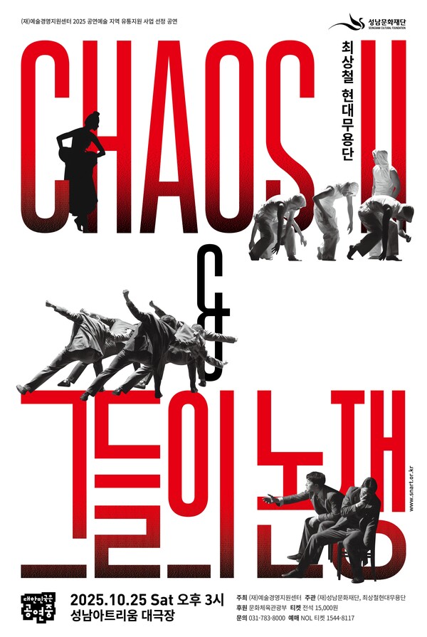 성남문화재단은 ‘(재)예술경영지원센터 2025 공연예술 지역 유통지원사업 선정작’으로 최상철현대무용단의 ‘CHAOS Ⅱ’와 ‘그들의 논쟁’을 오는 10월 25일 오후 3시 성남아트리움 대극장에서 선보인다.