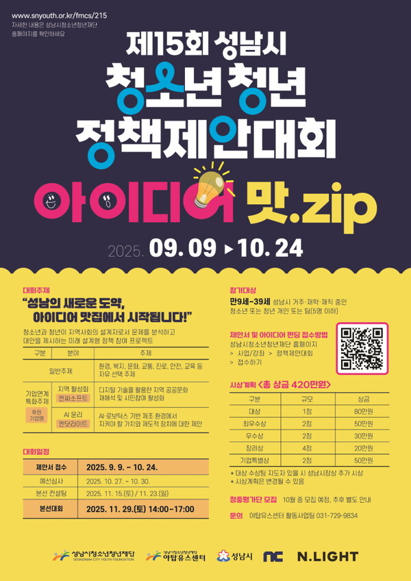 성남시청소년청년재단 야탑유스센터는 청소년과 청년이 지역사회 문제를 발굴하고 해결방안을 제시하는 제15회 성남시청소년청년정책제안대회 ‘아이디어 맛.zip’접수를 진행 중이라고 밝혔다. 대회 접수는 10월 24일까지 온라인으로 이뤄진다.