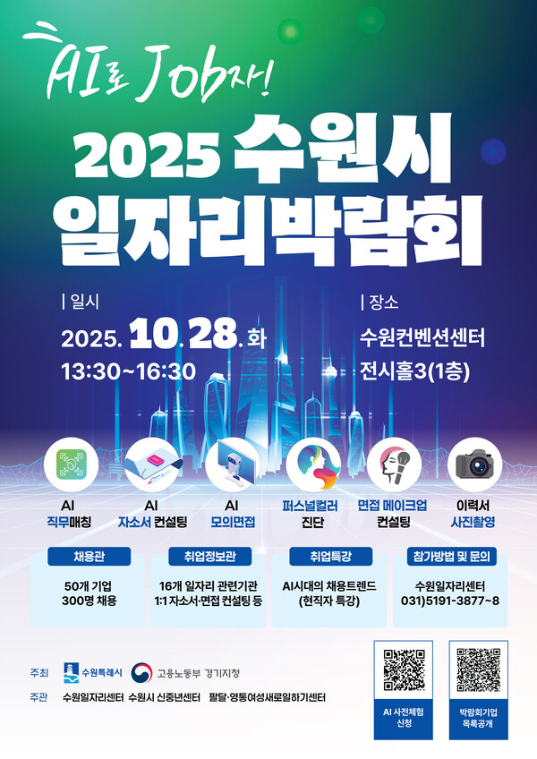 수원특례시와 고용노동부 경기지청은 10월 28일 오후 1시 30분부터 4시 30분까지 수원컨벤션센터 전시홀에서 ‘AI로 JOB자-2025 수원시 일자리박람회’를 개최한다.