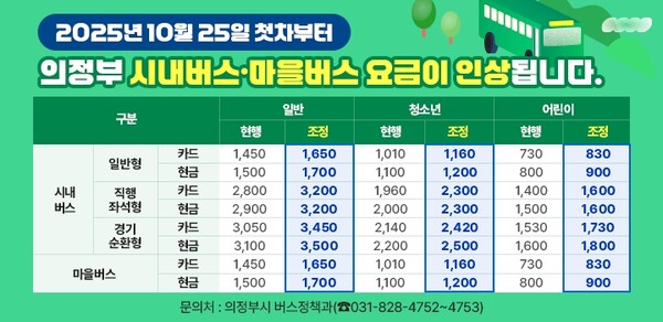 의정부시는 10월 25일 첫차부터 시내버스 및 마을버스 요금이 인상된다고 밝혔다.