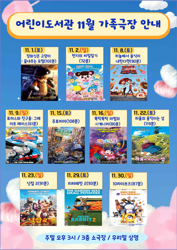 이번 11월 상영될 가족영화는 어린이와 가족 이용자들이 함께 웃고 공감할 수 있는 애니메이션 중심의 프로그램으로 구성되었으며, 관람료는 무료이다.