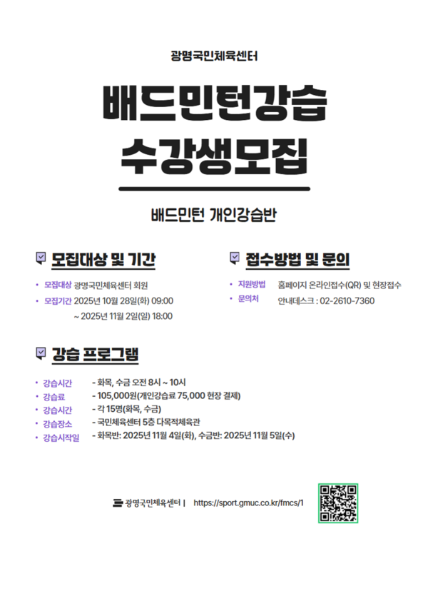 광명도시공사 광명국민체육센터가 시민들의 꾸준한 생활체육 수요와 배드민턴에 대한 높은 관심을 반영해 배드민턴 개인강습 프로그램을 신규 개설한다.