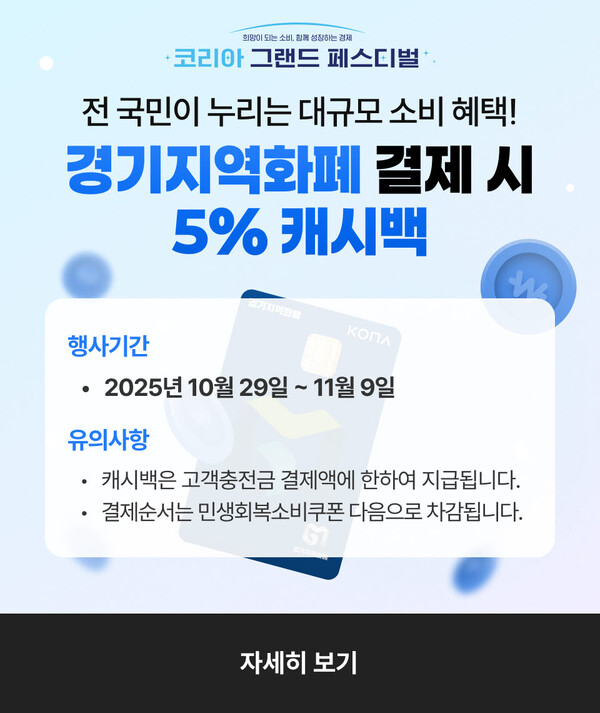 동두천시는 10월 29일부터 11월 9일까지 '코리아 그랜드 페스티벌' 기간 동안 지역화폐 ‘동두천사랑카드’ 결제금액의 5%를 캐시백으로 지급하는 이벤트를 진행한다고 밝혔다.