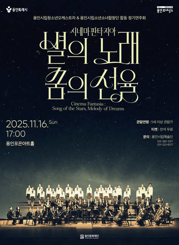 (재)용인문화재단은 오는 11월 16일 용인포은아트홀에서 용인시립청소년오케스트라와 용인시립소년소녀합창단 합동 정기연주회 '시네마 판타지아 : 별의 노래, 꿈의 선율'을 개최한다.