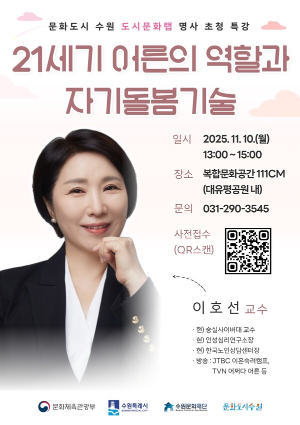 수원문화재단 관계자는 “이번 도시문화랩 명사초청 특강은 도시의 외로움을 완화하고, 세대 간 관계를 잇는 문화적 회복의 계기가 될 수 있다”며 “이호선 교수의 강연을 통해 시민들이 일상 속 관계와 마음의 건강을 돌아보는 뜻깊은 시간이 되길 바란다”고 말했다.