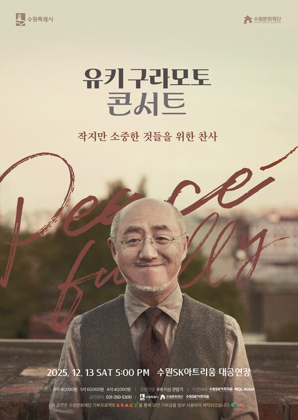 수원문화재단 관계자는 “유키 구라모토의 음악은 바쁜 일상 속에서 우리가 놓치기 쉬운 작고 소중한 것들의 아름다움을 일깨워 준다”며 “이번 콘서트는 수원을 따뜻하게 물들일 특별한 시간이 될 것”이라고 전했다.