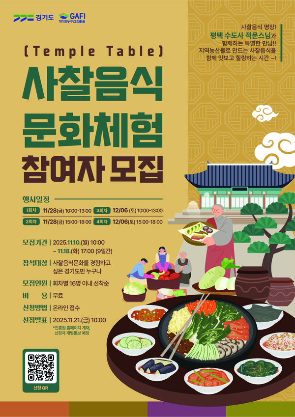 사찰음식문화체험은 16명씩 4개 체험을 선착순 모집하며, 경기도민 누구나 참여할 수 있다. 참가 신청은 오는 10일 오전 10시부터 18일 오후 5시까지 진행되며, 포스터에 안내된 큐알(QR)코드를 통해 가능하다.