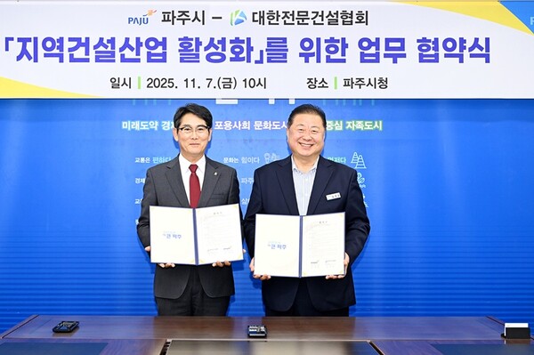 파주시와 대한전문건설협회 경기도회 파주시운영위원회(이하 ‘파주시 전문건설협회’)는 지역 건설산업 활성화를 위한 상생 업무협약을 체결하고, 관내 건설 경기 부양을 위해 적극 협력하기로 뜻을 모았다.