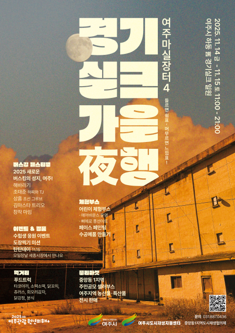 여주시는 오는 11월 14일부터 15일까지 이틀간 여주 경기실크 일원(여주시 하동 123-6번지)에서 '여주마실장터4 가을야행'을 개최한다고 밝혔다. 이번 행사는 '2025 새로운 버스킹의 성지, 여주!'라는 슬로건 아래, 깊어가는 가을밤의 정취를 더할 버스킹 페스티벌과 함께 다채로운 마켓과 체험을 선보일 예정이다.