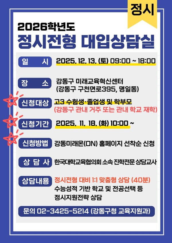 강동구는 오는 12월 13일, 수험생들의 효율적인 정시 지원 전략 수립을 돕기 위한 ‘2026학년도 정시전형 대입상담실’을 운영한다고 13일 밝혔다.