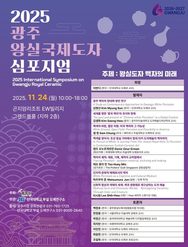올해로 두 번째를 맞이하는 국제도자심포지엄에는 미국, 싱가포르, 튀르키예, 중국, 일본, 대만 등 세계 각국의 도자 분야 전문가와 국내 관계자, 시민 등이 함께 참여한다. 이들은 ‘광주왕실 도자’의 역사적 가치와 브랜드 경쟁력을 세계적 관점에서 논의하며 광주 도자의 글로벌 위상 제고 방안을 모색할 계획이다.