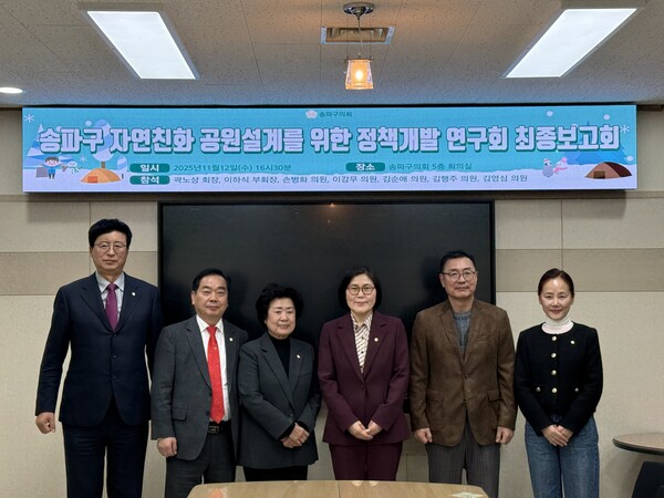 이날 연구회를 마무리 하면서 회장인 곽노상 의원은 “본 연구가 단순한 보고서에 그치지 않고 향후 정책에 적극적으로 반영되어 우리 송파구가 아이들과 주민 모두가 행복한 도시로 한 걸음 더 나아가는 계기가 되길 바란다”고 밝혔다.