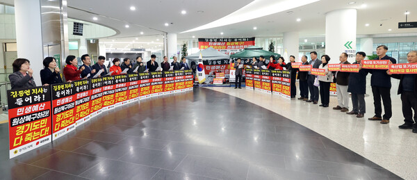 경기도의회 건설교통위와 보건복지위 국민의힘 의원들이 지난 28일 도의회 1층에서 기자회견을 열고 김동연 지사의 ‘민생예산 삭감’과 정무라인의 행정사무감사 불출석을 강하게 비판했다.
