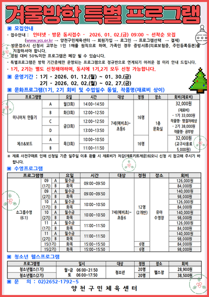 양천구시설관리공단 양천구민체육센터는 오는 2026년 1월 2일 오전 9시부터, 겨울방학을 맞이하는 관내 초등학생부터 청소년을 위한 ‘2026년 겨울방학 특별프로그램’에 대한 접수를 시작한다고 밝혔다.