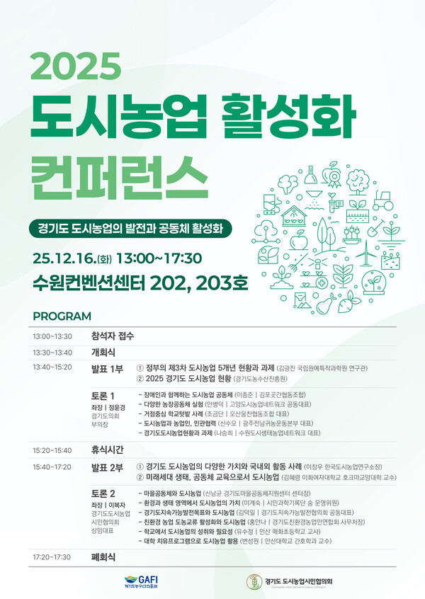 경기도농수산진흥원은 오는 16일 수원컨벤션센터 202, 203호에서 ‘2025 도시농업 활성화 컨퍼런스’를 개최한다고 밝혔다.