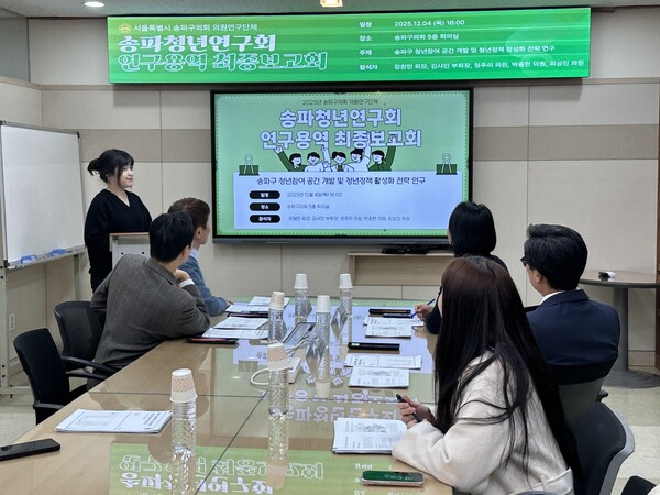 지난 12월 5일 송파구의회에서 연구용역 최종결과보고회를 열어 용역 수행기관, 의원이 함께 연구결과를 공유하고 의견을 수렴했다. 이 과정에서 송파형 청년센터 조성의 필요성과 실행 방향이 재확인되었고, 이번 본예산 심사에서 청년센터 건립 예산을 반영하는 핵심 근거 자료로 활용됐다.
