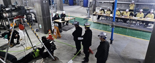 훈련은 ▲ 밀폐공간 내 작업자 의식 저하 상황을 가정한 상황전파 및 초기보고 ▲ 위험요인 파악과 긴급구조 요청 ▲ 구조대 도착 전 응급조치 및 현장 통제 ▲ 환기 장치 및 가스농도 측정 장비 활용 ▲ 사고 원인 분석 및 사후조치 절차 점검 순으로 진행됐다.