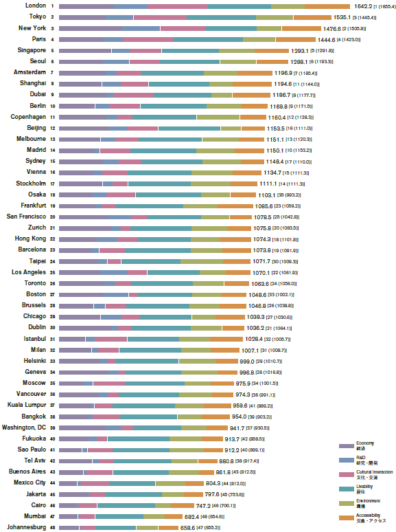 GPCI는 경제, 연구 개발, 문화 교류, 거주, 환경, 교통 접근성 등 6개 분야를 통해 전 세계 주요 도시 종합 경쟁력을 평가하는 지수다. 올해는 평가 항목이 26개에서 27개, 세부 지표가 70개에서 72개로 확대됐다.