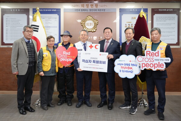 안성시의회는 지난 19일 대한적십자 경기도지사에 2026년 적십자 특별회비를 전달하며 긴급구호 및 따뜻한 이웃나눔 활동에 동참을 하였다.