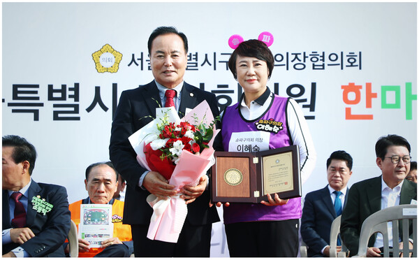 서울특별시 송파구의회는 지난 서울특별시 구의회 의원 한마음 체육대회에서 이혜숙 의장이 투철한 봉사정신과 책임 있는 의정활동 공로를 인정받아 대한민국 지방의정 봉사상을 수상했다고 밝혔다.