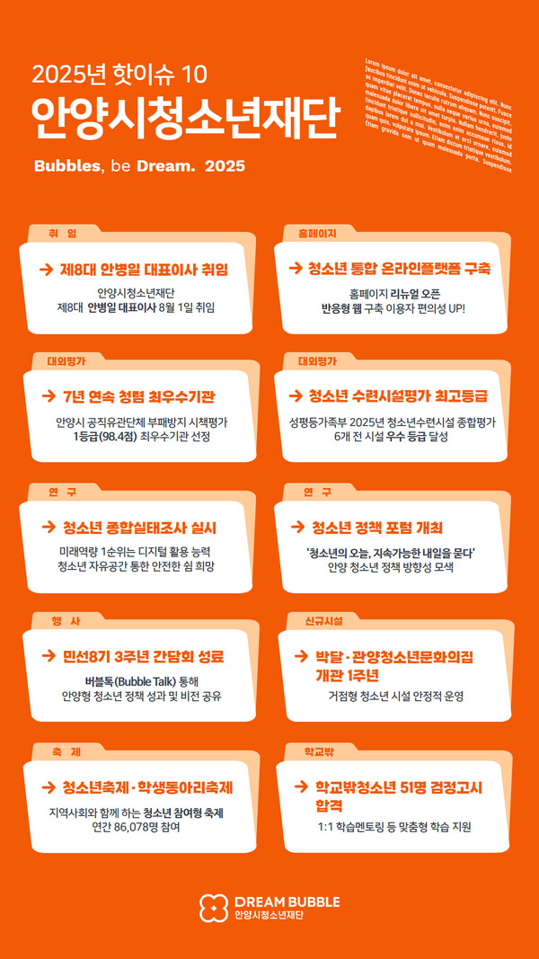 안양시청소년재단은 올 한 해를 돌아보는 ‘2025년 안양시 청소년재단 핫이슈 10’을 선정하고, 2025년 청소년 정책 컨트롤타워로서의 기능을 강화해 청소년 체감형 정책 성과를 거뒀다고 30일 밝혔다.