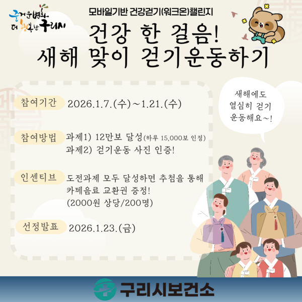 구리시는 시민들의 건강한 생활 습관 형성을 위해 1월 7일부터 1월 21일까지 15일간 ‘건강 한 걸음! 새해맞이 걷기 운동하기’ 참여 잇기(챌린지)를 운영한다고 밝혔다.