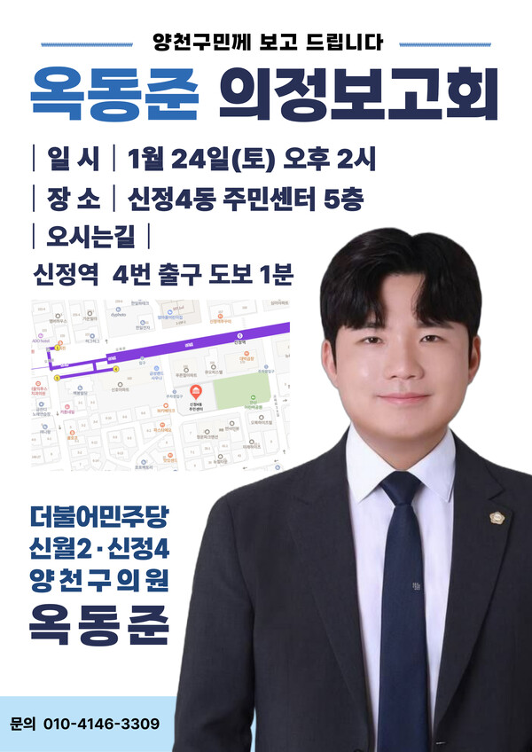 양천구의회 옥동준 의원(더불어민주당, 신정4·신월2동)이 오는 24일 오후 2시 양천구 신정4동 주민센터에서 의정보고회를 열어 그간의 의정활동 성과와 향후 계획을 양천구민께 보고하는 자리를 마련한다.