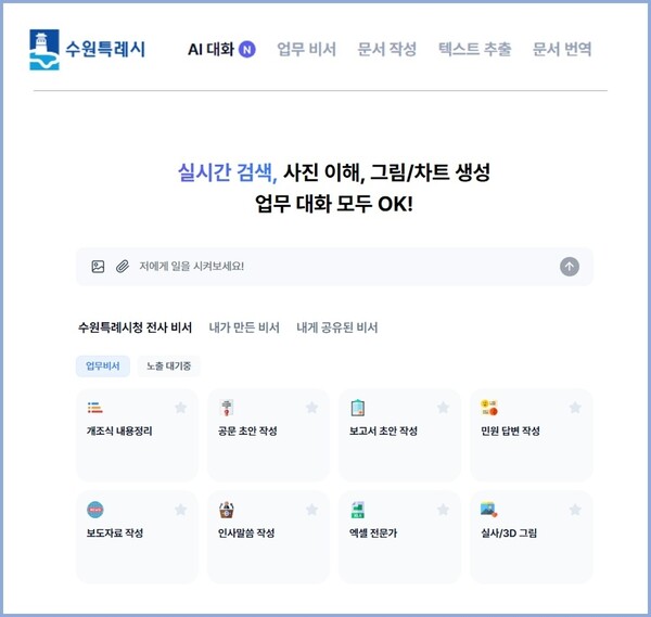 이재준 수원시장은 “인공지능(AI) 업무 비서 서비스 도입으로 수동·반복적인 행정 업무 수행 방식을 개선하고, 인공지능을 활용한 스마트 행정 환경을 조성할 것”이라며 “행정 전반에 인공지능 활용을 확산해 공직자들이 창의적이고 가치 있는 업무에 집중할 수 있는 업무 환경을 만들어 가겠다”고 밝혔다.