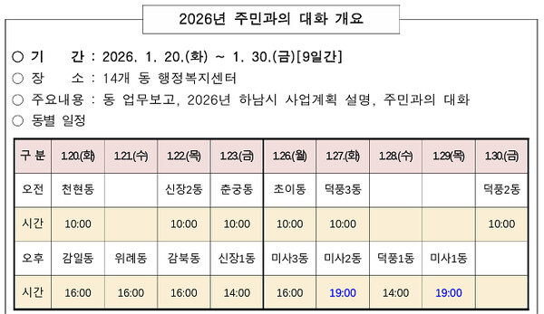 하남시는 오는 1월 20일부터 30일까지 관내 각 동 행정복지센터를 순회하며 ‘2026년 주민과의 대화’를 개최한다고 밝혔다.