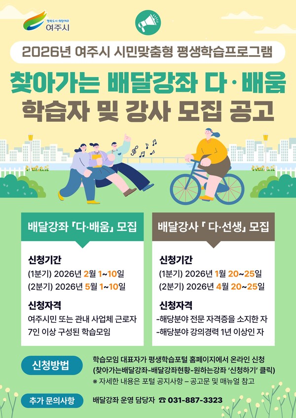 여주시는 시민 누구나 원하는 시간과 장소에서 배움을 이어갈 수 있도록 지원하는 2026년 시민 맞춤형 평생학습 프로그램 ‘찾아가는 배달강좌’의 학습자와 강사를 모집한다고 밝혔다.