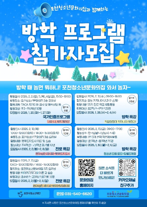 참가 신청은 프로그램별 일정에 따라 2월 초까지 포천청소년문화의집 누리집을 통해 선착순으로 신청 가능하다. 프로그램 세부 내용과 신청 방법은 누리집에서 확인할 수 있으며, 기타 문의는 전화(031-540-6620~6626)로 하면 된다.