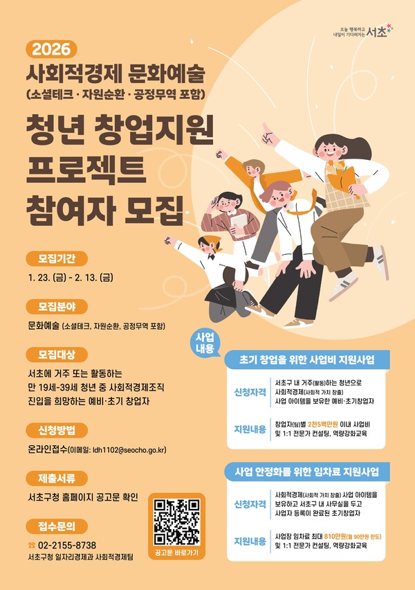 모집 대상은 서초구에 거주하거나 활동하는 만 19세 이상 39세 이하 청년 중 문화·예술 관련 사회적경제(사회적 가치 창출) 사업 아이템을 가진 예비·초기 창업 팀으로, 사업비 지원과 임차료 지원 2개 분야 중 하나를 선택해 신청하면 된다.
