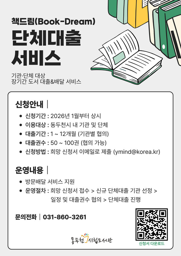 동두천시 도서문화사업소 시립도서관은 지역 독서문화 확산을 위해 관내 기관 및 단체를 대상으로 장기 도서 대출 서비스인 ‘책드림(Book-Dream)’을 2026년에도 연중 운영한다고 밝혔다.