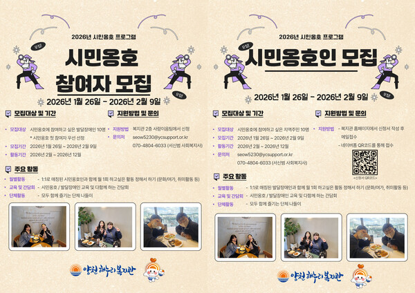 양천해누리복지관은 발달장애인의 자기결정권 강화와 지역사회 관계 형성을 지원하기 위해 2월 9일까지 시민옹호 사업에 참여할 발달장애인과 시민옹호인(지역주민)을 각 10명씩 모집한다.