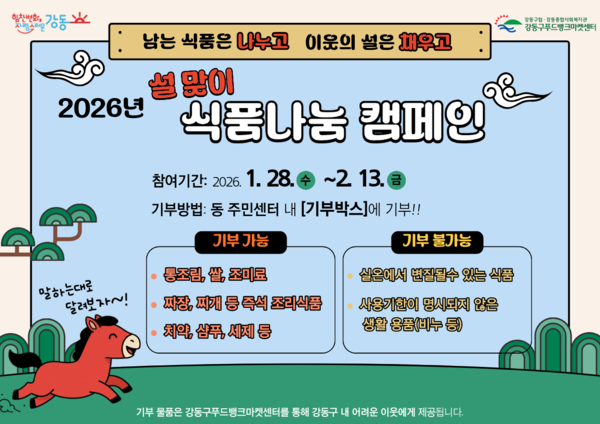 강동구는 다가오는 설 명절을 맞이하여 복지 사각지대 주민을 지원하고 나눔 문화를 확산하기 위해 1월 28일부터 2월 13일까지 ‘2026년 설 맞이 식품 나눔 캠페인’을 추진한다고 밝혔다.