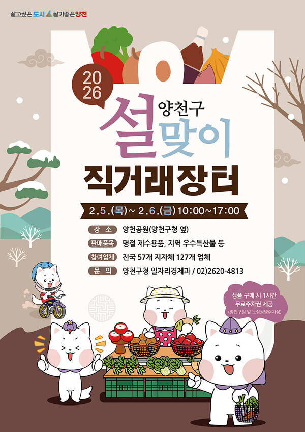 ‘2026년 양천구 설맞이 직거래장터’는 오는 2월 5일과 6일 양일간 오전 10시부터 오후 5시까지 양천공원에서 열린다. 행사와 관련한 자세한 사항은 양천구청 일자리경제과로 문의하면 된다.