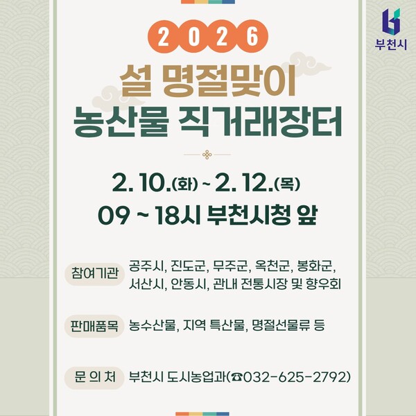 부천시는 설 명절을 앞두고 2월 10일부터 12일까지 시청 정문 앞에서 ‘2026년 설 명절맞이 농산물 직거래장터’를 연다.