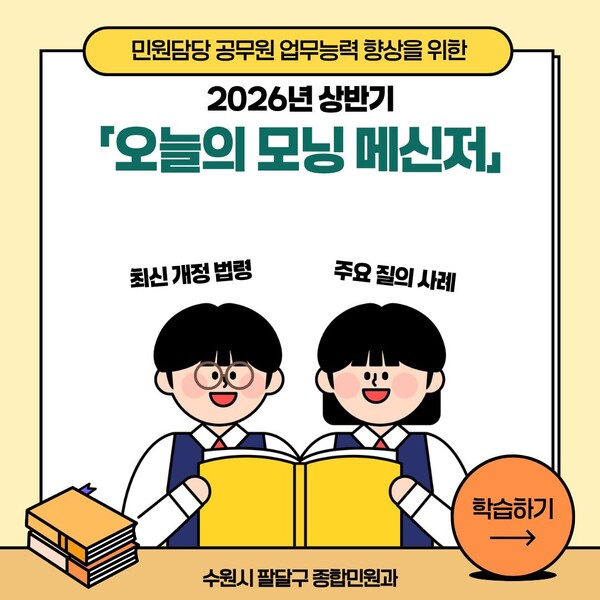 김미라 팔달구 종합민원과장은 “매일 아침 짧은 시간을 투자한 꾸준한 직무 학습이 시민들에게 더욱 정확하고 친절한 행정서비스를 제공하는 밑거름이 될 것”이라며, “앞으로도 직원들의 민원 대응 역량을 강화해 시민이 체감할 수 있는 만족도 높은 구정을 펼쳐 나가겠다”라고 전했다.