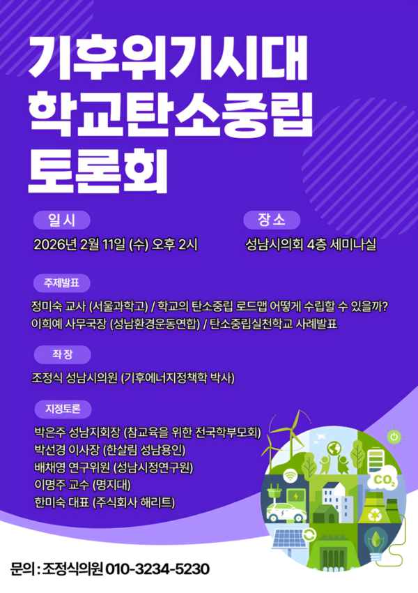 기후위기 대응과 학교 현장의 탄소중립 실천 방안을 논의하기 위한 '기후위기시대 학교탄소중립 토론회'가 오는 2월 11일 오후 2시, 성남시의회 4층 세미나실에서 열린다.