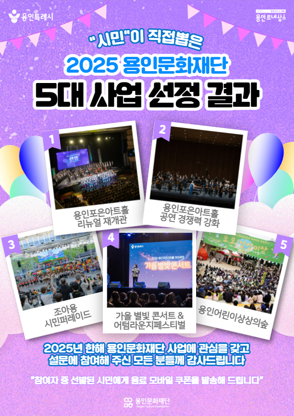 용인문화재단은 시민 참여 온라인 투표를 통해 ‘시민이 선정한 2025년 용인문화재단 5대 사업’을 발표했다.