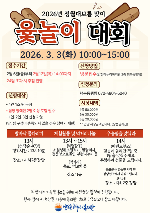 프로그램 중 하나로 진행되는 윷놀이대회는 장애인 및 지역주민 누구나 참여 가능하며, 토너먼트 방식으로 운영된다. 대회 참가자에게는 순위에 따라 소정의 상금이 제공될 예정이며, 참여를 희망하는 주민은 12일까지 양천해누리복지관 2층 행복동행팀을 방문해 신청하면 된다.