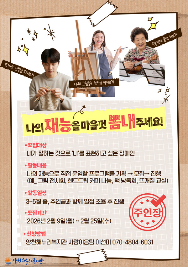 양천해누리복지관은 장애인이 자신의 강점과 재능을 바탕으로 프로그램을 직접 기획하고 운영하는 사회참여 자기주도사업 ‘주인장’에 참여할 성인 장애인을 2월 25일(수)까지 모집한다.