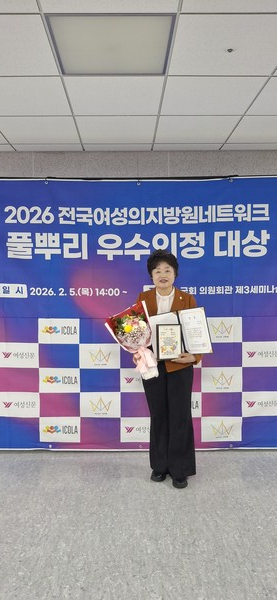 이미재 의원이 지난 2월 5일 전국여성지방의원네트워크가 주관한 '풀뿌리 우수의정대상'에서 우수상을 수상했다.